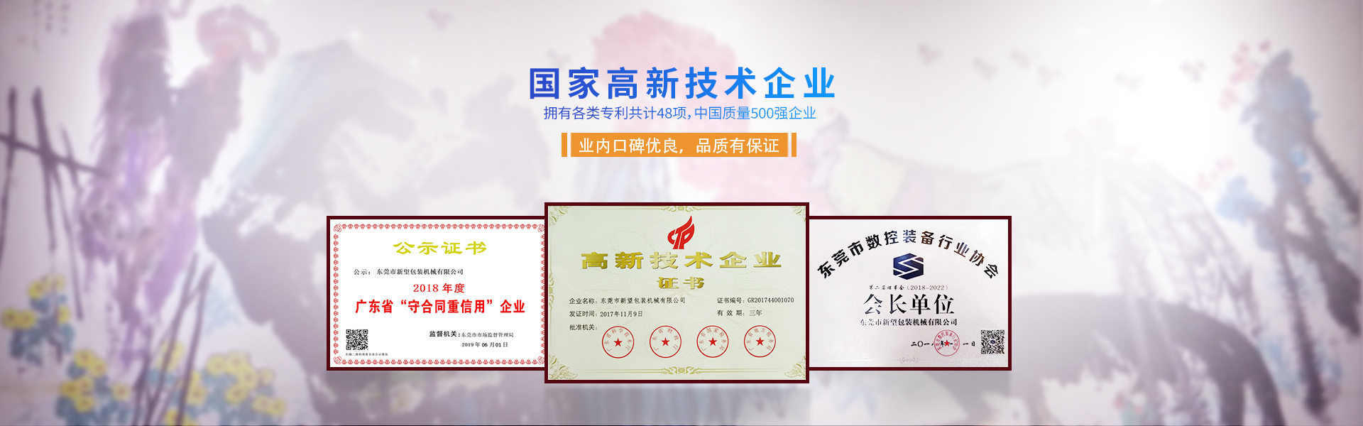 新望機械成立于1998年,位于東莞市東部工業園區的中心地帶——企石鎮東平村,交通方便、環(huán)境優(yōu)美舒適、視野開闊。公司注冊資本2000萬元,擁有辦公室、廠房等18,000多平方米。已通過ISO9001:2015國際質量管理體系認證,擁有國家各類專利共計58項。是東莞市企石鎮工商聯副會長單位、東莞市企石鎮文學藝術界聯合會副主席單位、東莞市環(huán)保包裝行業協會副會長單位、東莞市數控裝備行業協會第二屆會長單位、廣東省包裝技術協會常務理事單位、廣東省膠粘劑行業協會理事單位、廣東省著名商標企業、國家高新技術企業。